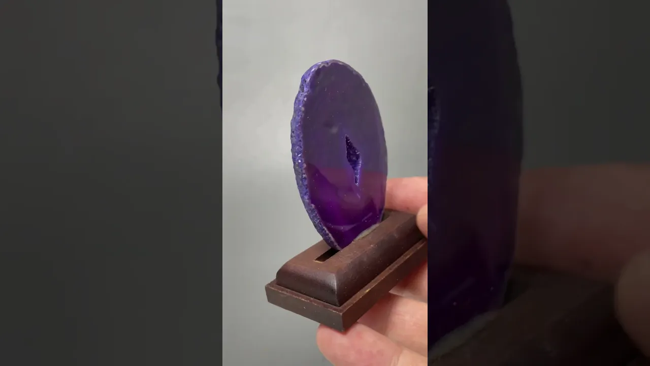 Прекрасный символический подарок к агатовой свадьбе! Пластина тонированного агата с отверстием (фрагмент жеоды) с кристаллами горного хрусталя. Пластина приклеена к подставке. Отполирована с двух сторон