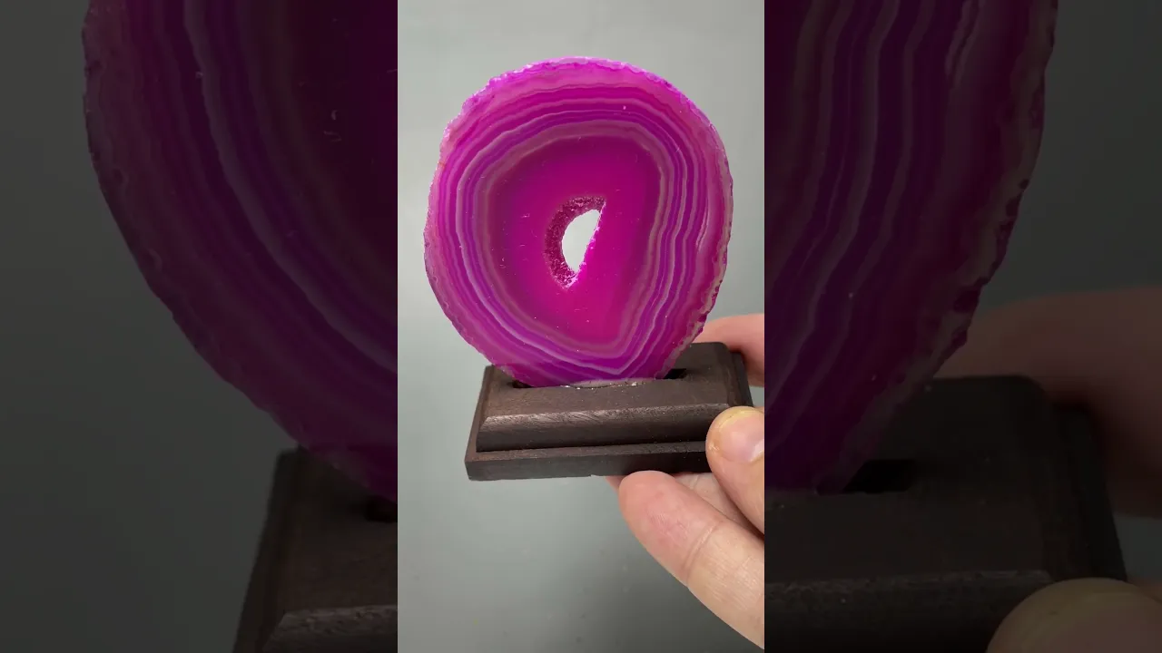 Прекрасный символический подарок к агатовой свадьбе! Пластина тонированного агата с отверстием (фрагмент жеоды) с кристаллами горного хрусталя. Пластина приклеена к подставке. Отполирована с двух сторон