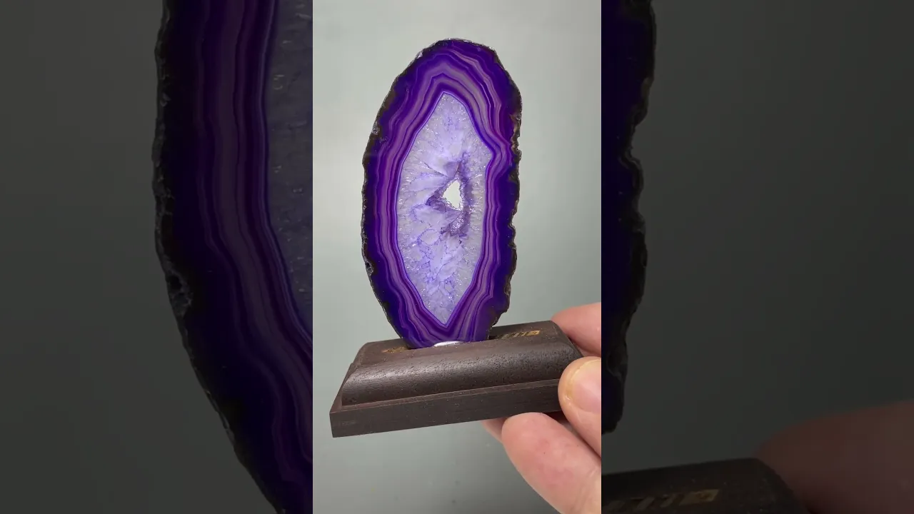 Прекрасный символический подарок к агатовой свадьбе! Пластина тонированного агата с отверстием (фрагмент жеоды) с кристаллами горного хрусталя. Пластина приклеена к подставке. Отполирована с двух сторон